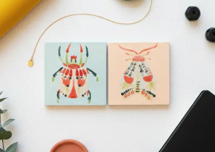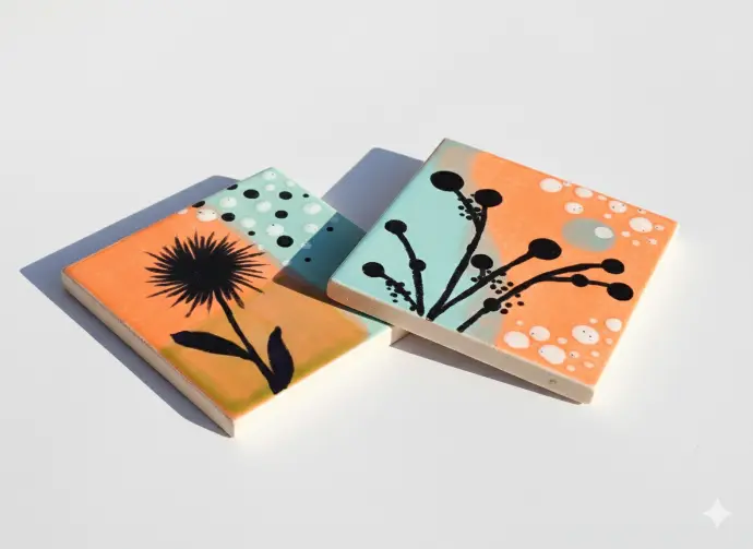 aan de slag met twee ambachtelijke keramieken tegeltjes (10,5 x 10,5 x 1 cm).